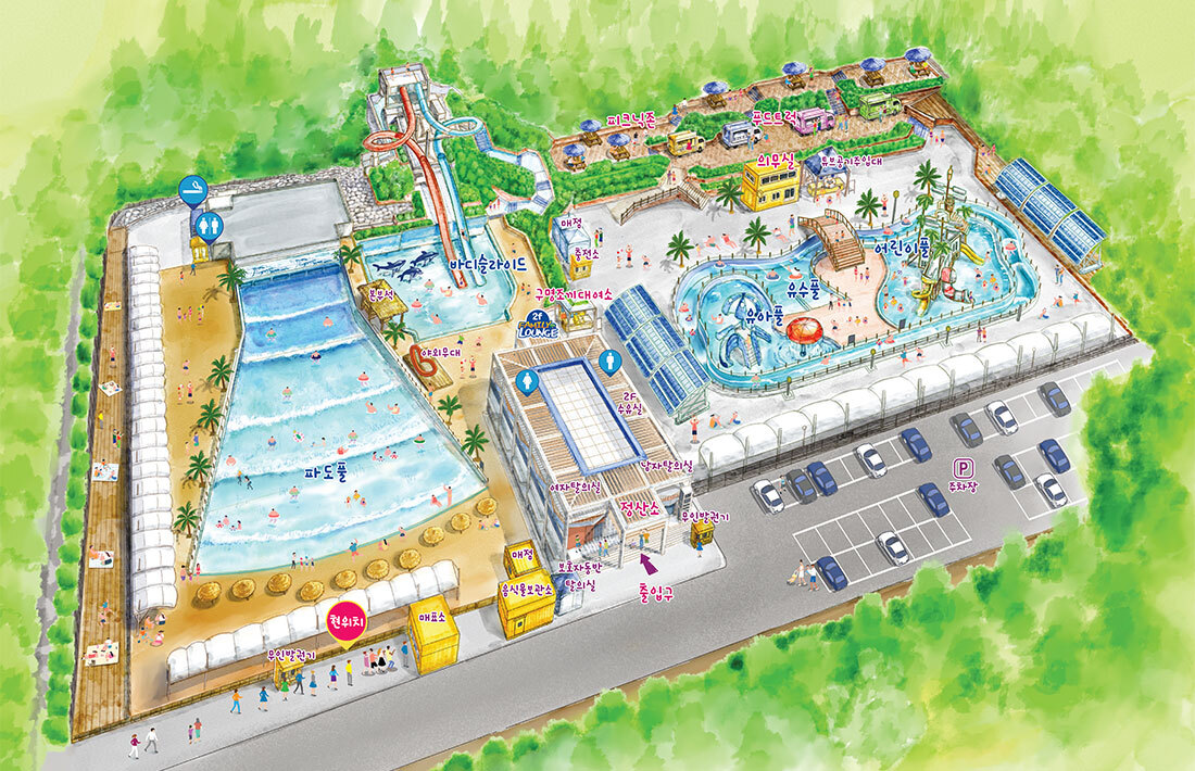 - 파도풀, 유수풀, 바디슬라이드, 유아풀 등 놀이시설과 야외매점 피크닉 존 등의 편의시설 및 휴게공간 마련